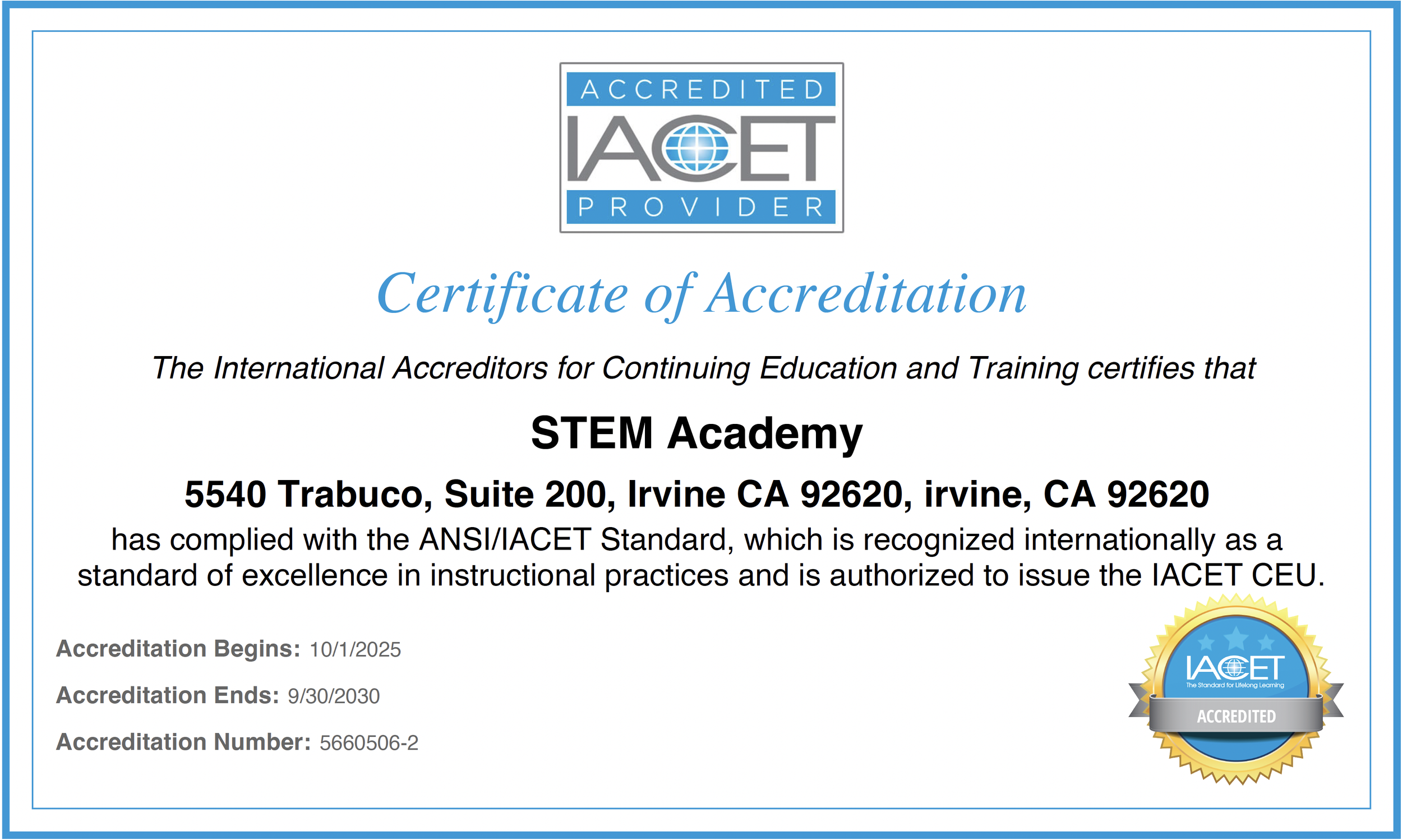 We’re proud to be accredited by International Accreditors for Continuing Education and Training (IACET), recognized for meeting the American National Standards Institute (ANSI/IACET) Standard — a mark of excellence and trust in how we design and deliver STEM learning.